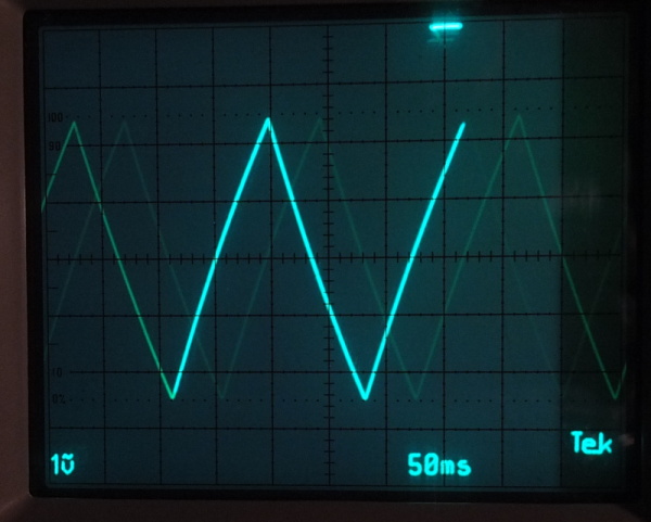 PCF8591 has one 8-bit DAC. This sketch shows triangle wave on DAC output:
